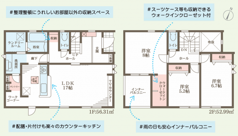 - システムキッチン、カウンターキッチン、シャンプードレッサー、洗浄便座、浴室乾燥機、追い焚き、ウォークインクローゼット、モニタ付インターホン、駐車場2台分、床下収納、トイレ2箇所