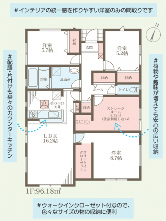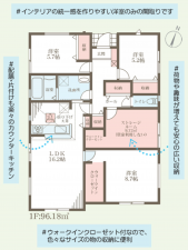 - システムキッチン、カウンターキッチン、シャンプードレッサー、洗浄便座、浴室乾燥機、追い焚き、ウォークインクローゼット、モニタ付インターホン、駐車場2台分、床下収納